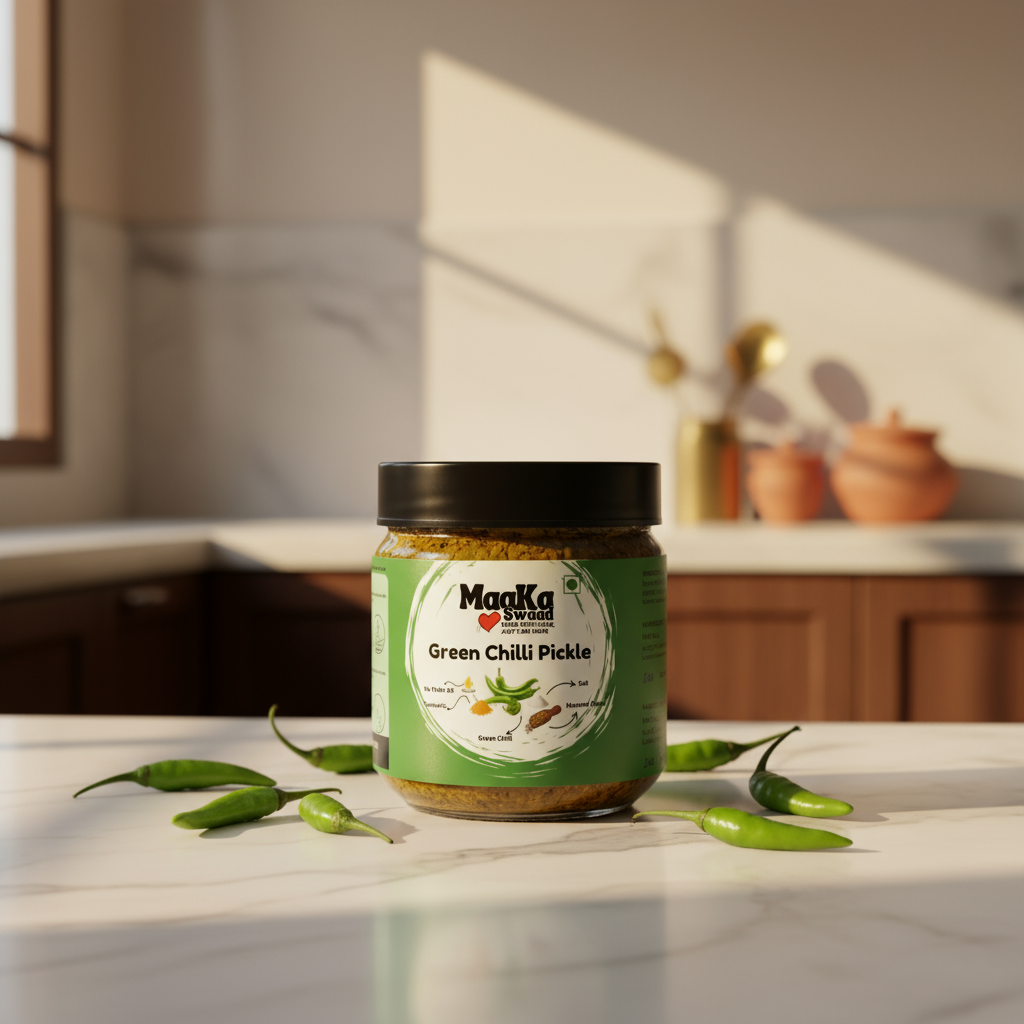 Add a bold kick to every bite with MaakAswaad Homemade Chilli Pickle – a handcrafted blend of handpicked green chillies, aromatic spices, and traditional methods passed down through generations. Made in small batches for maximum freshness and flavour, this pickle strikes the perfect balance between heat, tang, and spice.
